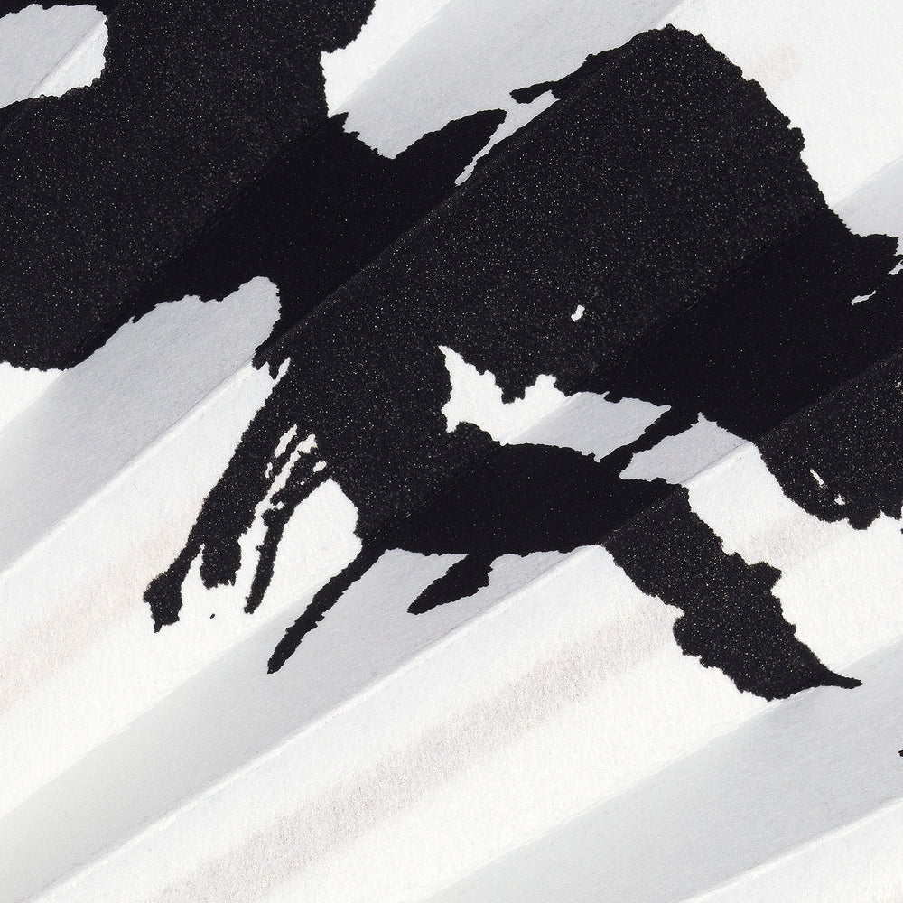羽ばたく3本足の八咫烏(やたがらす)をデザイン。白と黒のシックなモノトーンカラーながら、職人が一本一本手作業で入れたきらびき(パール加工)によって上品さと高級感を演出しています。
