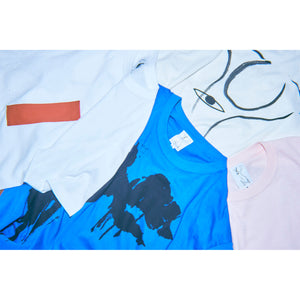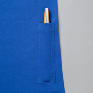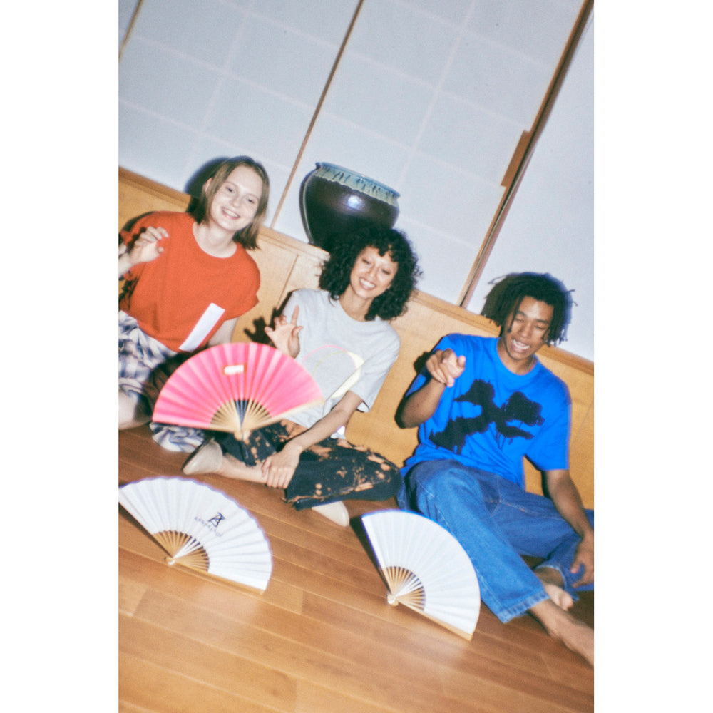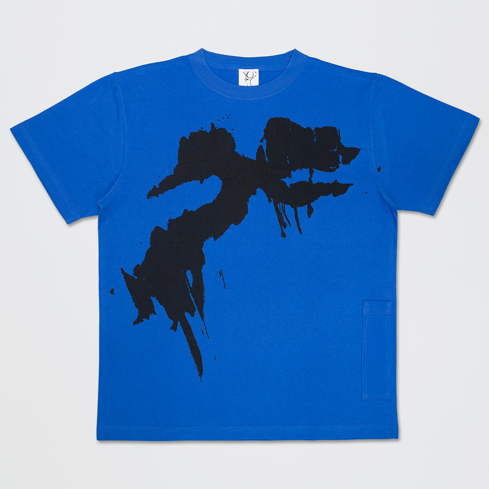3本脚の八咫烏(やたがらす)のグラフィックをデザインしたTシャツ。ブルー地で、左腰に扇子を差すことができるポケット付き。