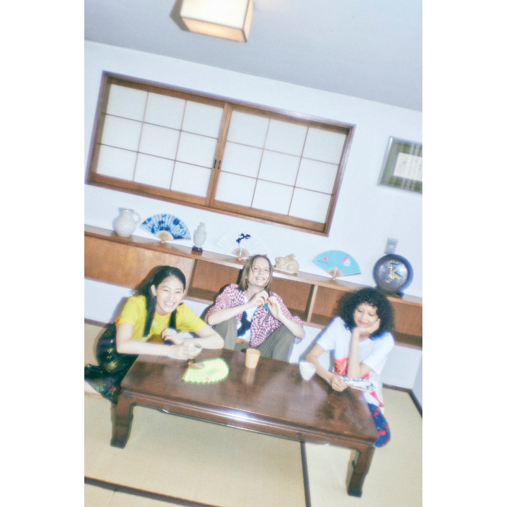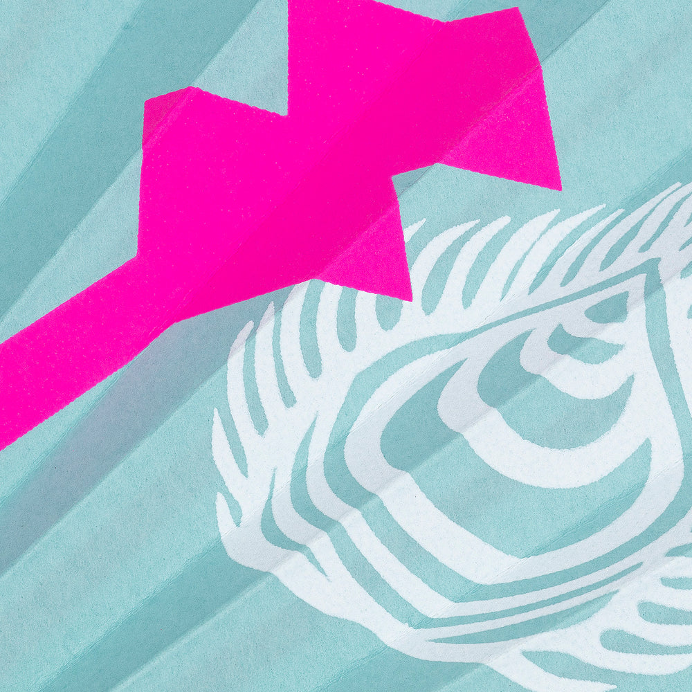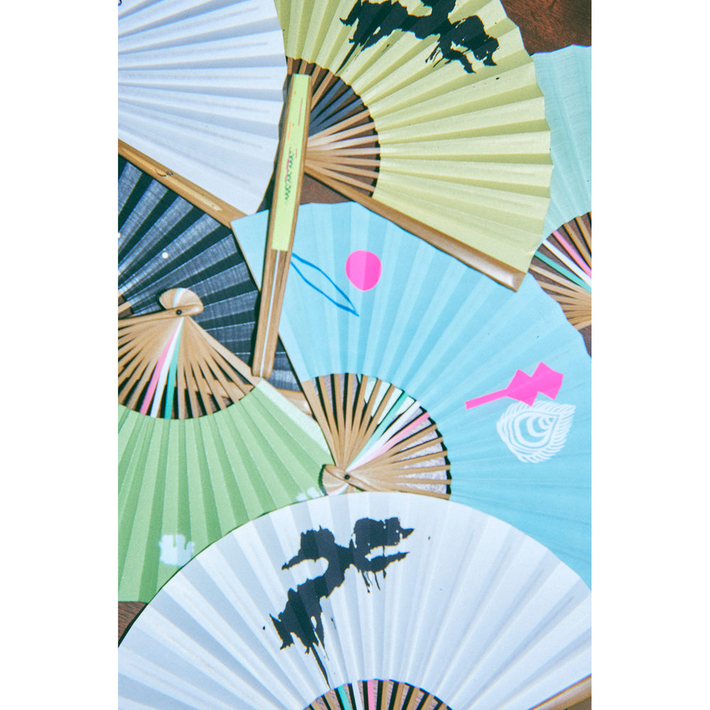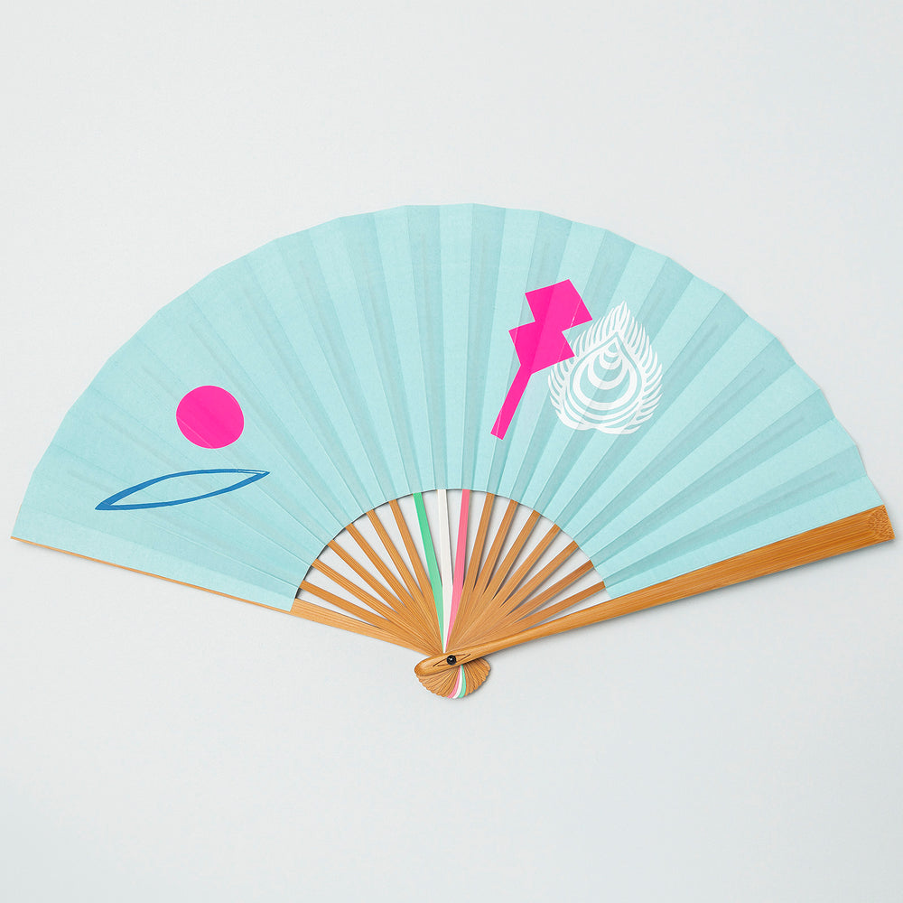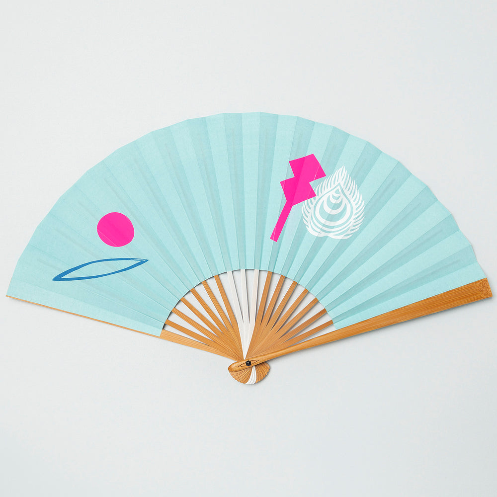 ブランドシンボルにも表現されている“目”や、日の出、神々の化身をモチーフにデザイン。職人が刷毛で一本ずつ色を入れ、立体感が生まれたマットなブルーの紙地に、シルクスクリーンの鮮やかな蛍光ピンクが映えます。
