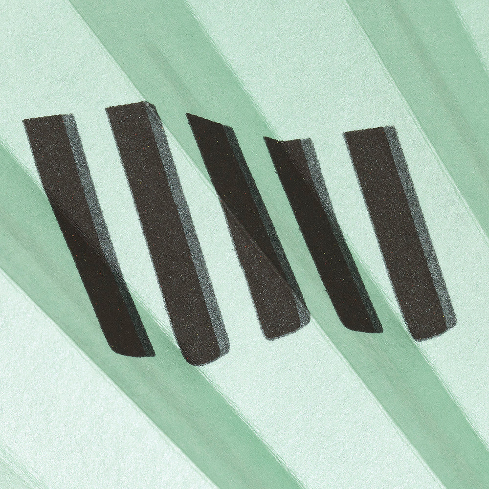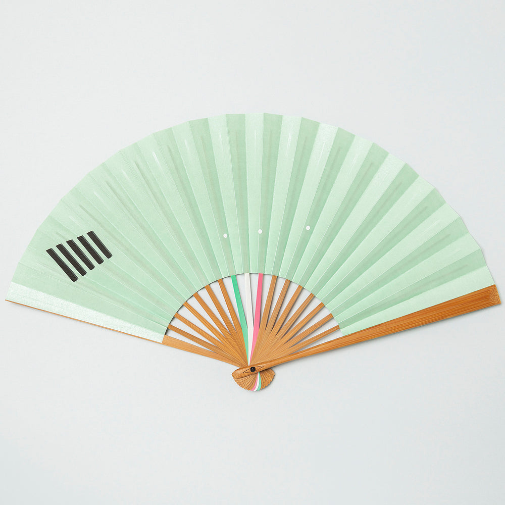 5本の線と3つの点。古くから吉数とされる奇数からインスピレーションを得て、無限に広がる宇宙を表現。職人が刷毛で一本ずつ色を入れた青みがかったペールグリーンと、シルクスクリーン印刷によるマットな黒の質感の差は扇面に立体感を生み出します。