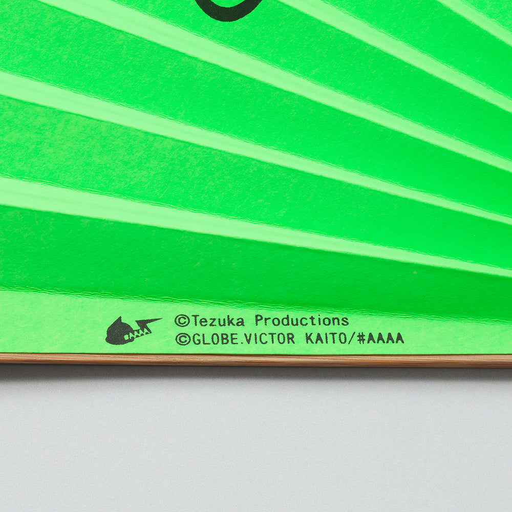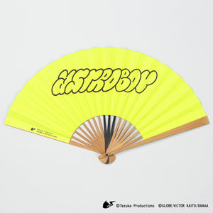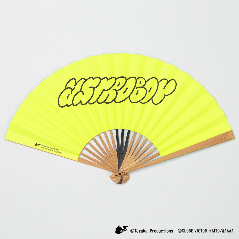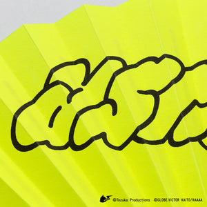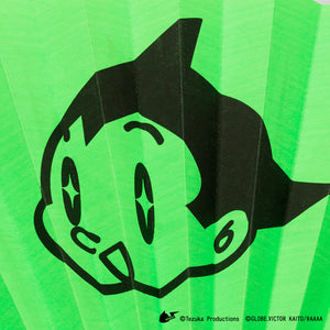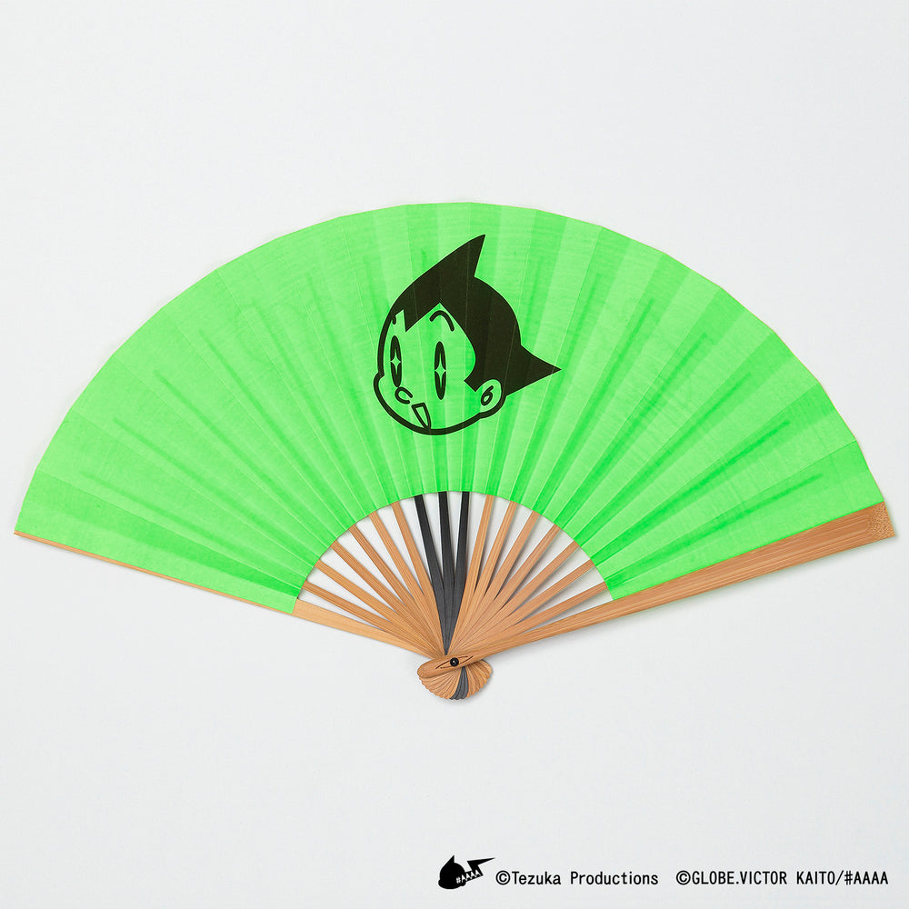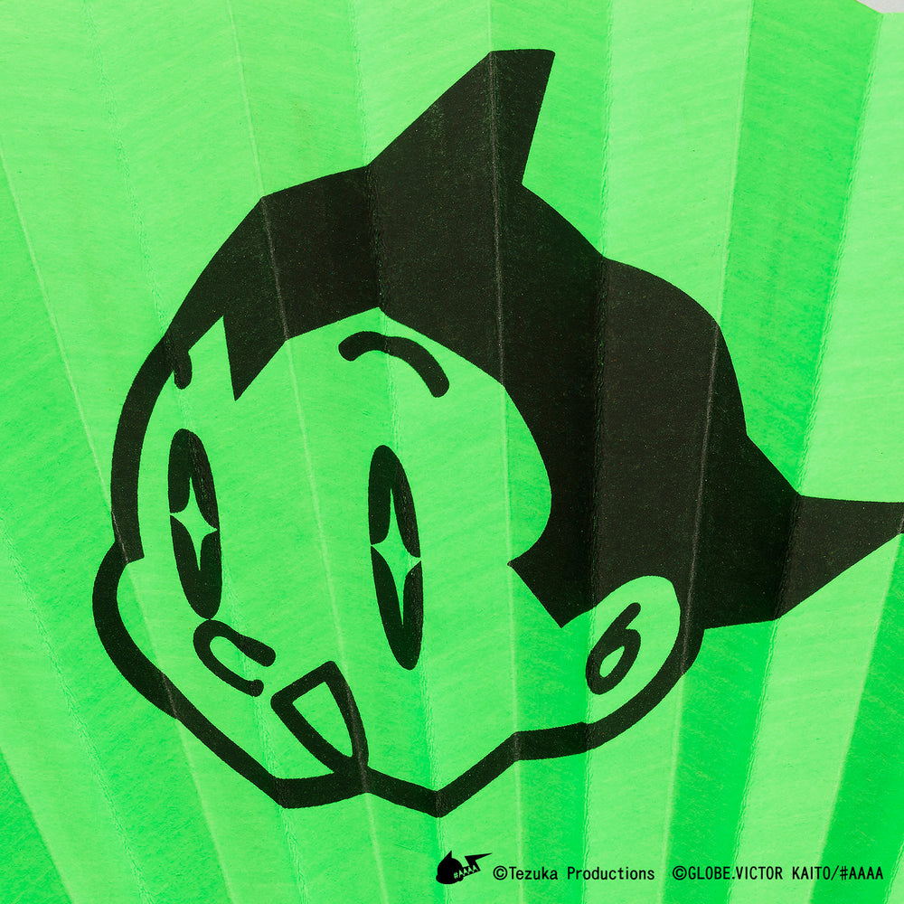 眩しいほどの蛍光グリーンと蛍光イエローの扇面に、現代的でPOPなアトムのモチーフとストリート感溢れるグラフィティロゴを表現しました。