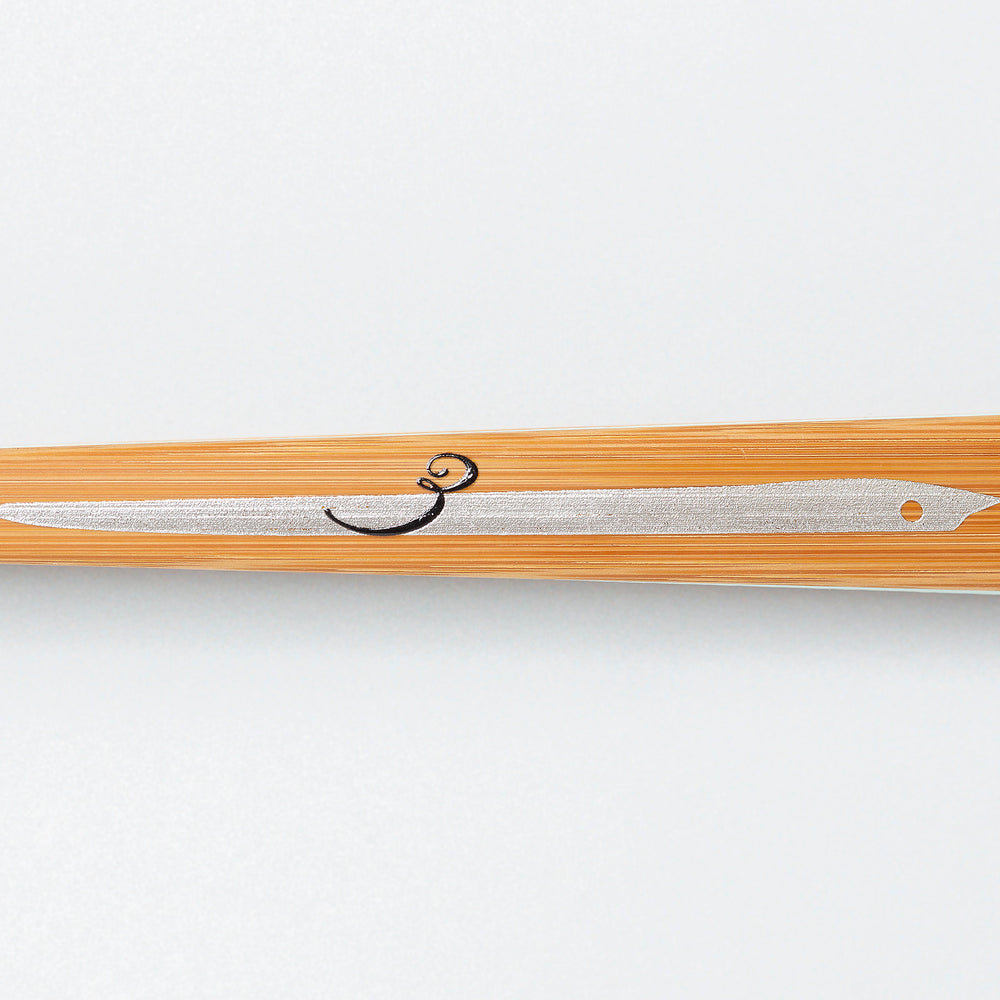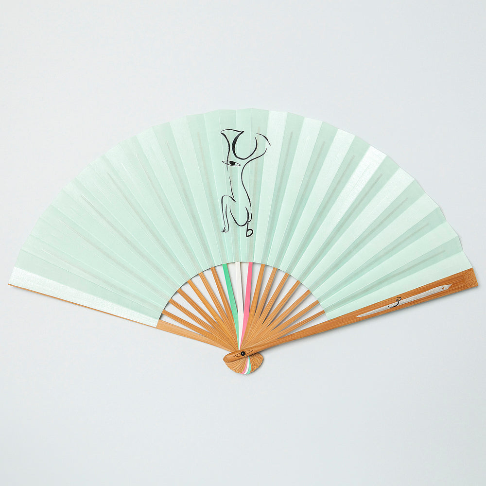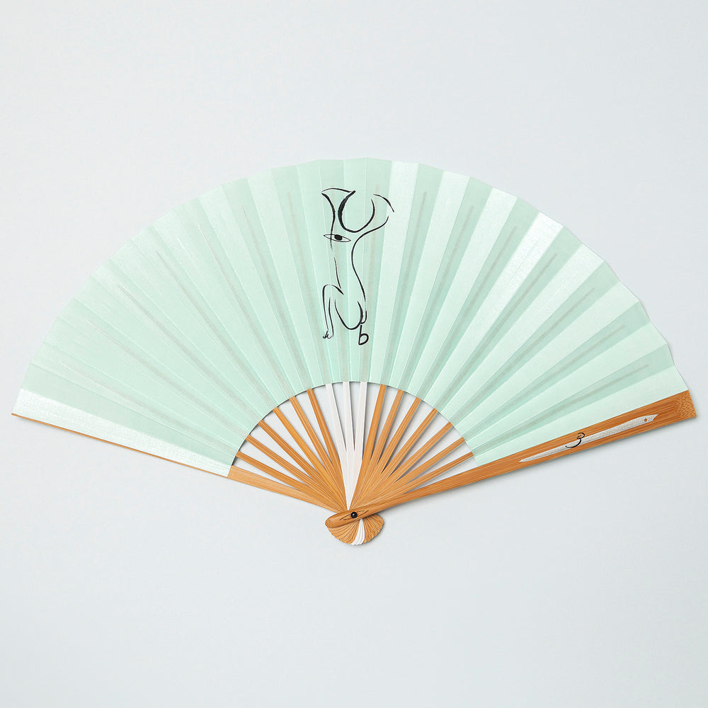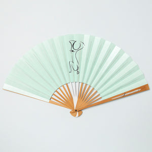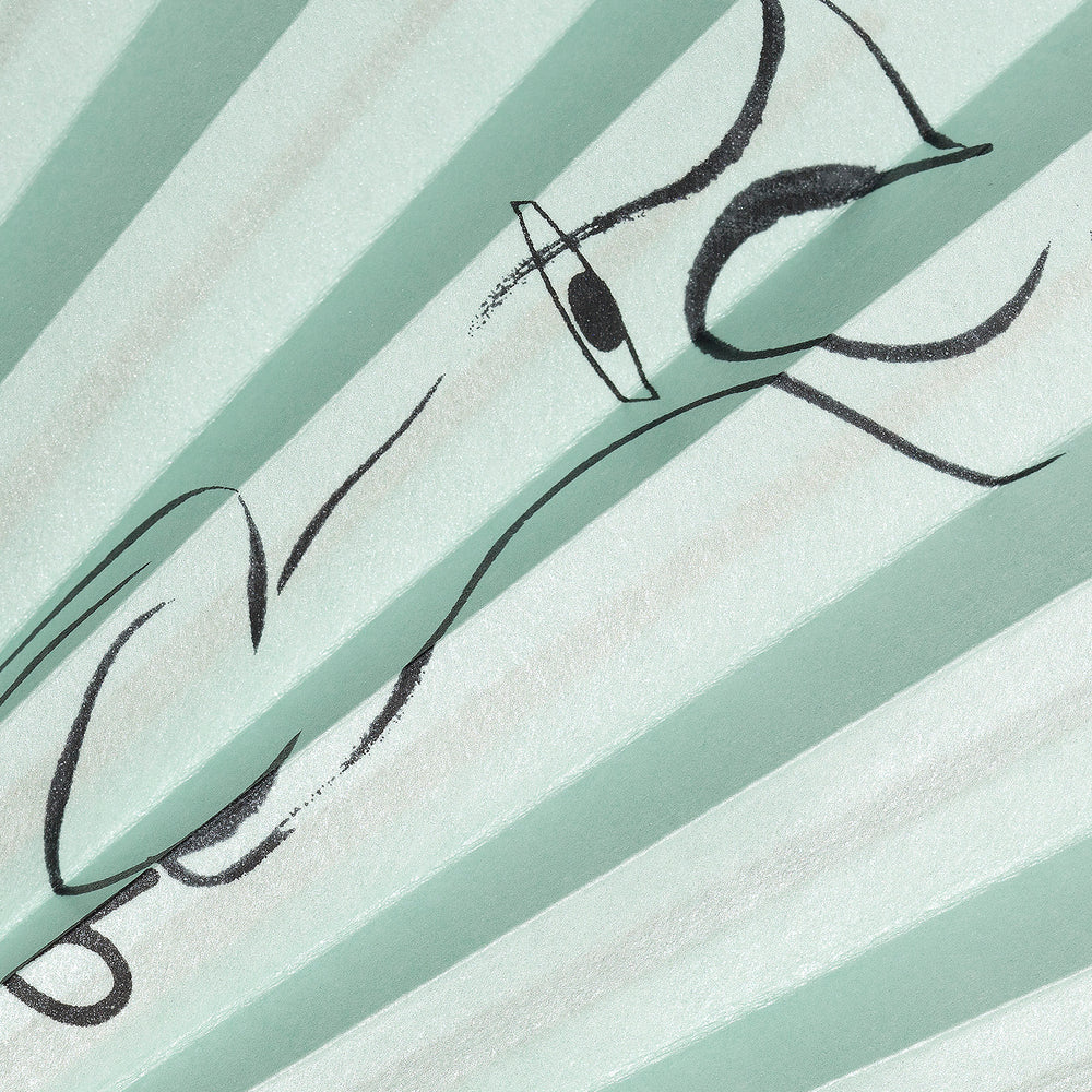 「バナナとイエロう」のブランドシンボルを中央に配置。職人が刷毛で一本ずつ入れる青磁をイメージした透明感のある淡い青緑色や、きらびき(パール加工)は上品さと立体感を演出します。親骨には八咫烏をイメージしたモチーフを銀箔で表現。