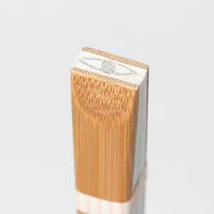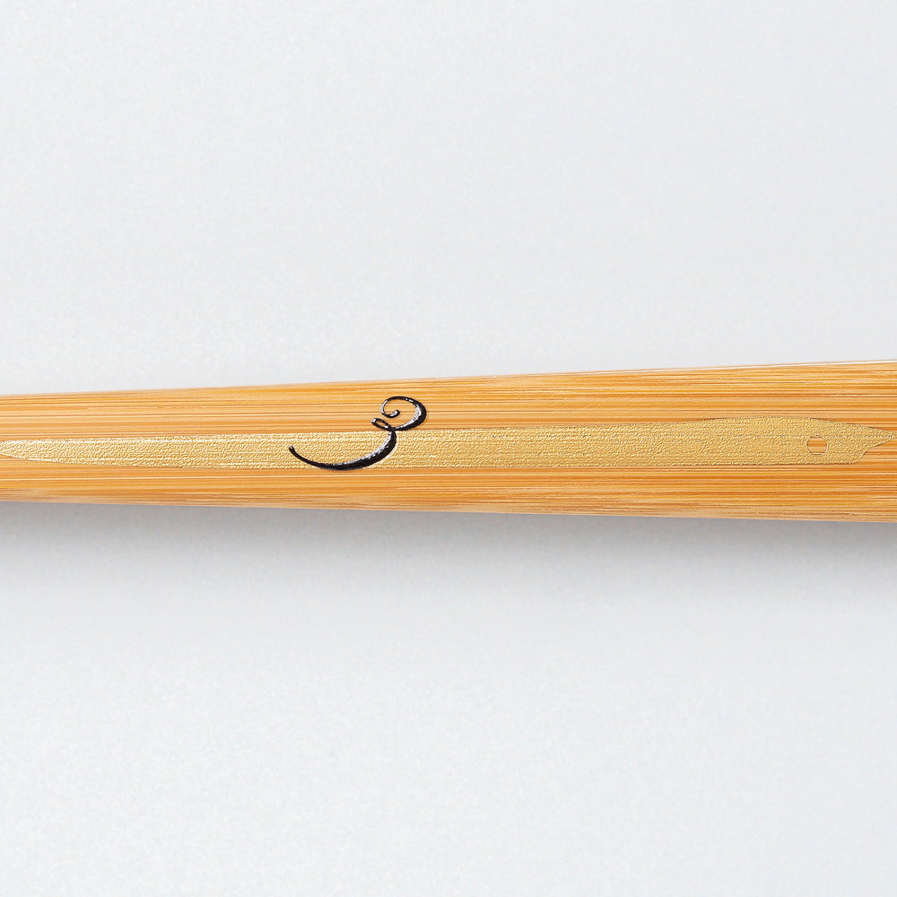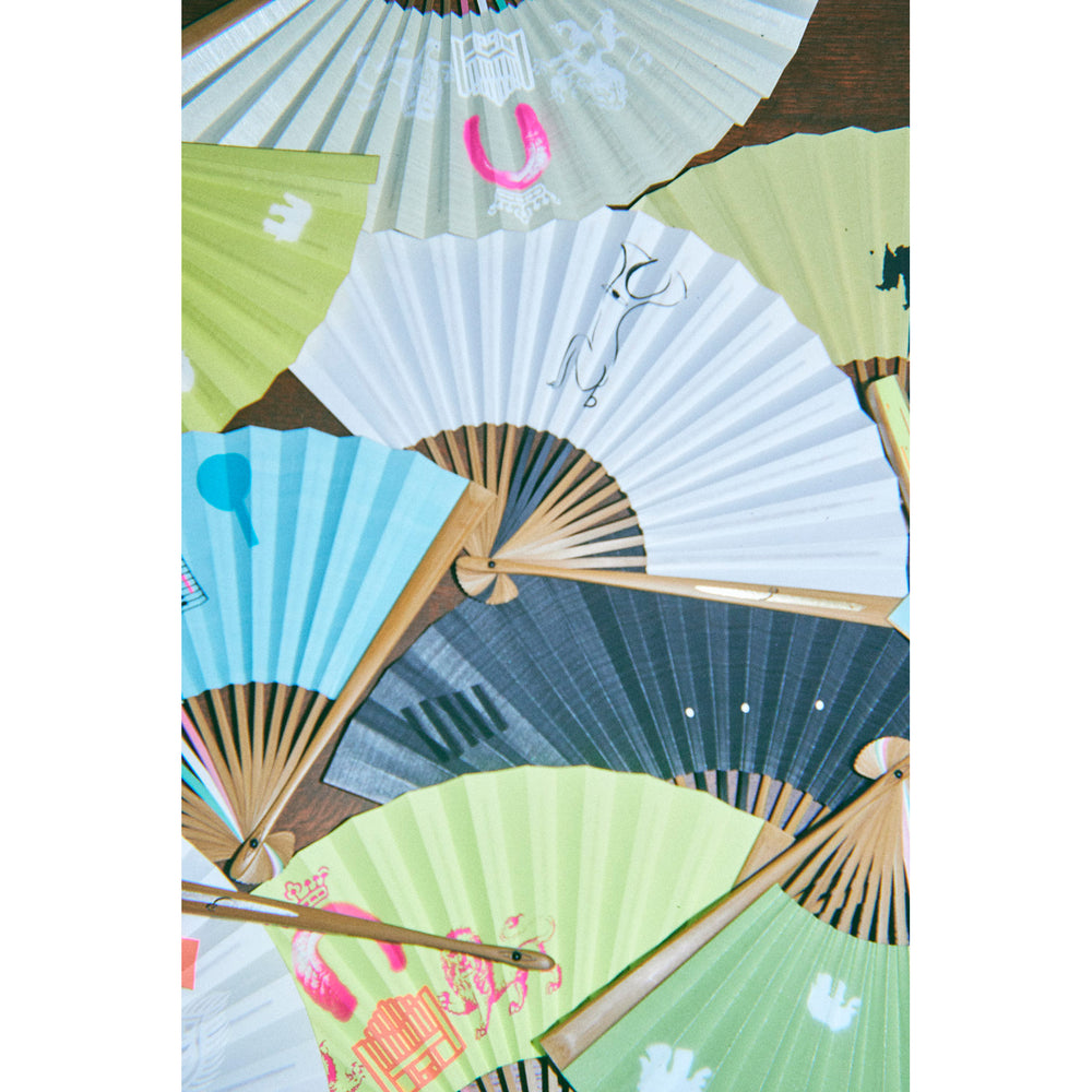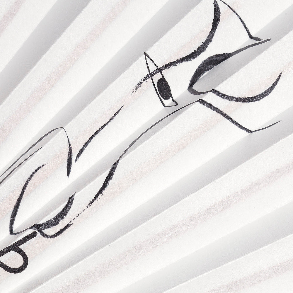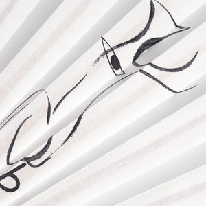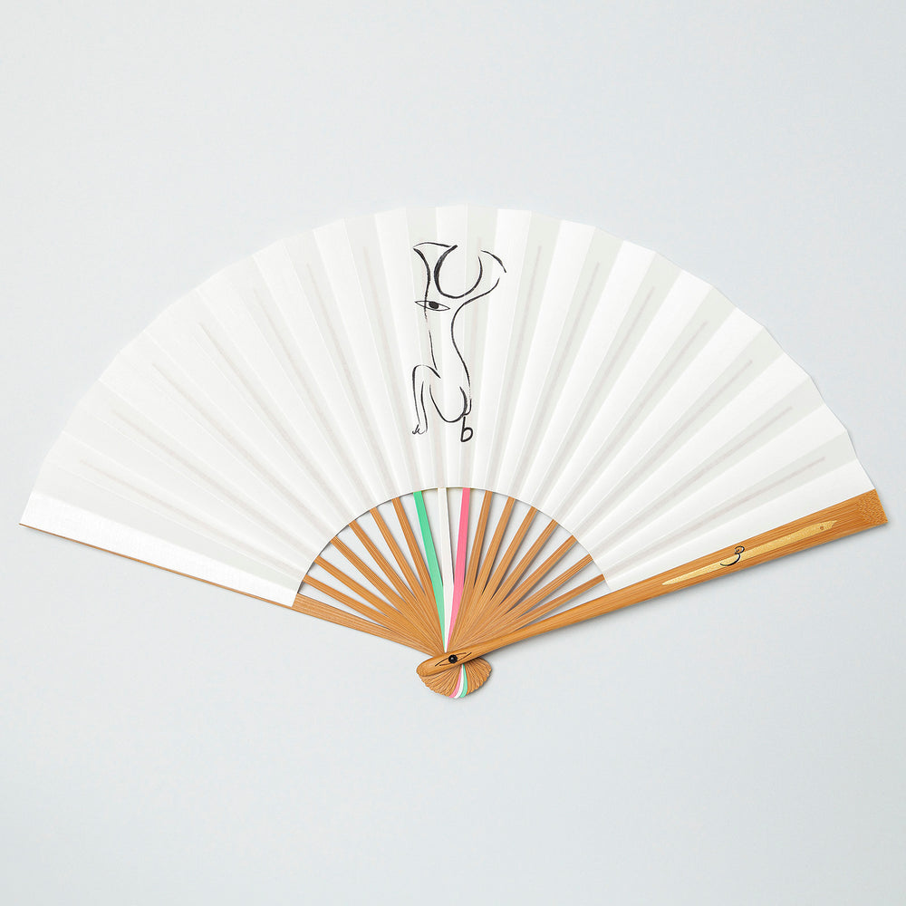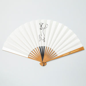 「バナナとイエロう」のブランドシンボルを中央に配置。どんな装いにも合うシンプルなホワイト。職人が一本一本手作業で入れたきらびき(パール加工)は上品さと立体感を演出します。親骨には八咫烏をイメージしたモチーフを金箔で表現。
