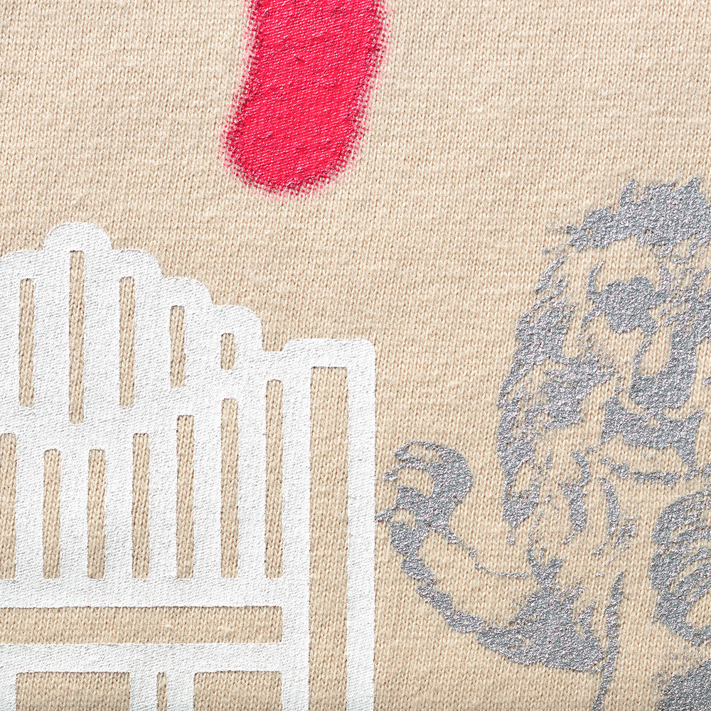 2頭のライオンと、“音楽の父”バッハへのオマージュをモチーフにした柄を胸元にプリント。同柄の扇子と合わせたコーディネートもおすすめです。左腰に扇子を差すことができるポケット付き。き。