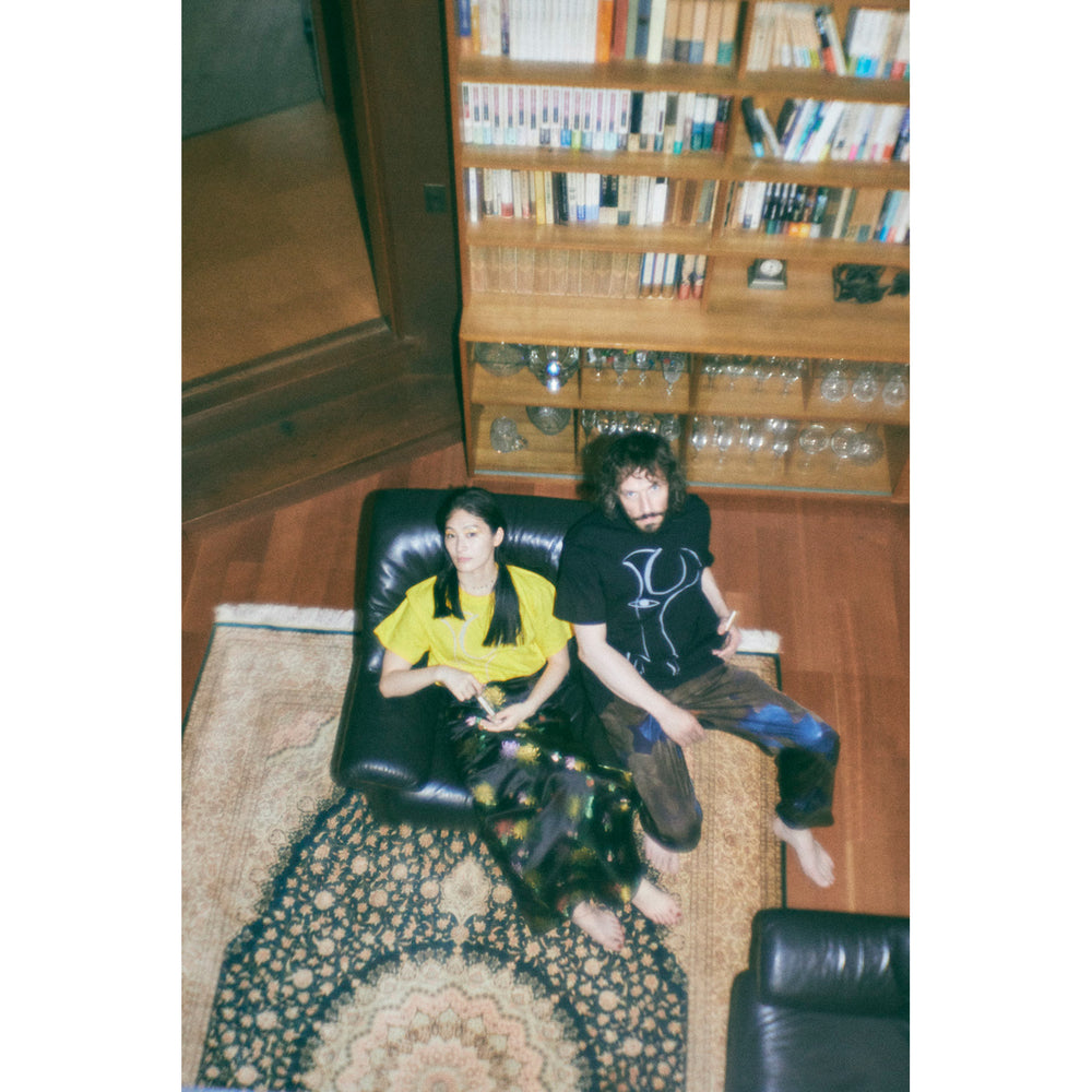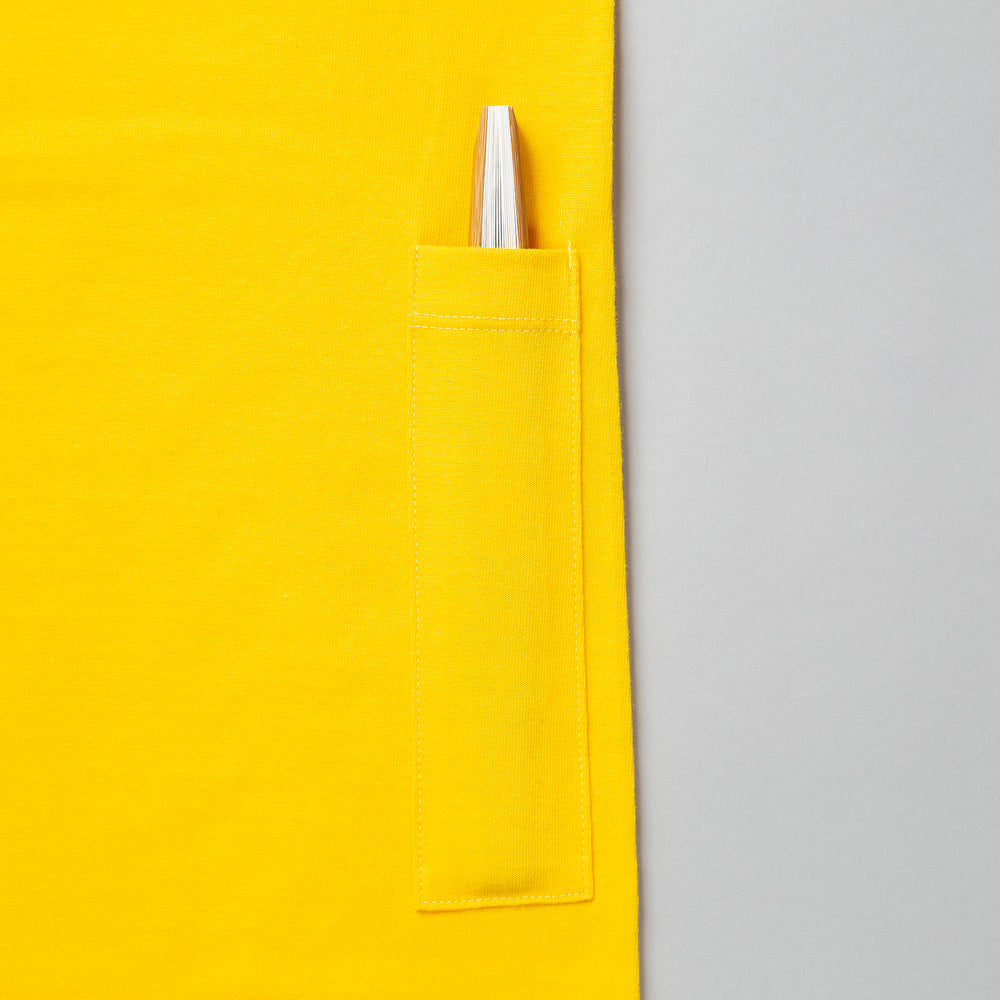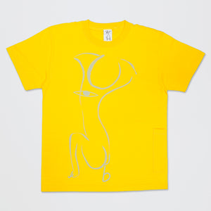 ブランドシンボルのグラフィックを配置したTシャツ。イエロー地で、左腰に扇子を差すことができるポケット付き。