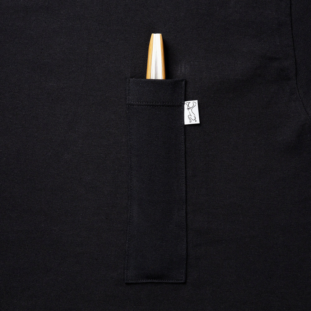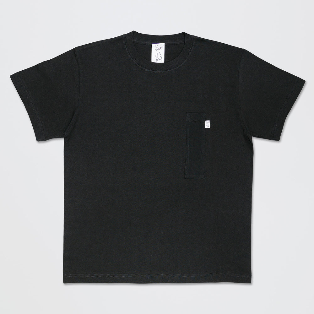シンプルでベーシックなTシャツ。左胸に扇子を差すことができるポケット付き。ブラックベースの生地に、ポケット横のブランドタグがアクセント。