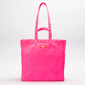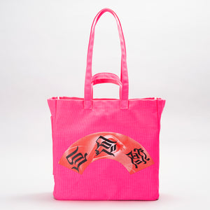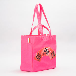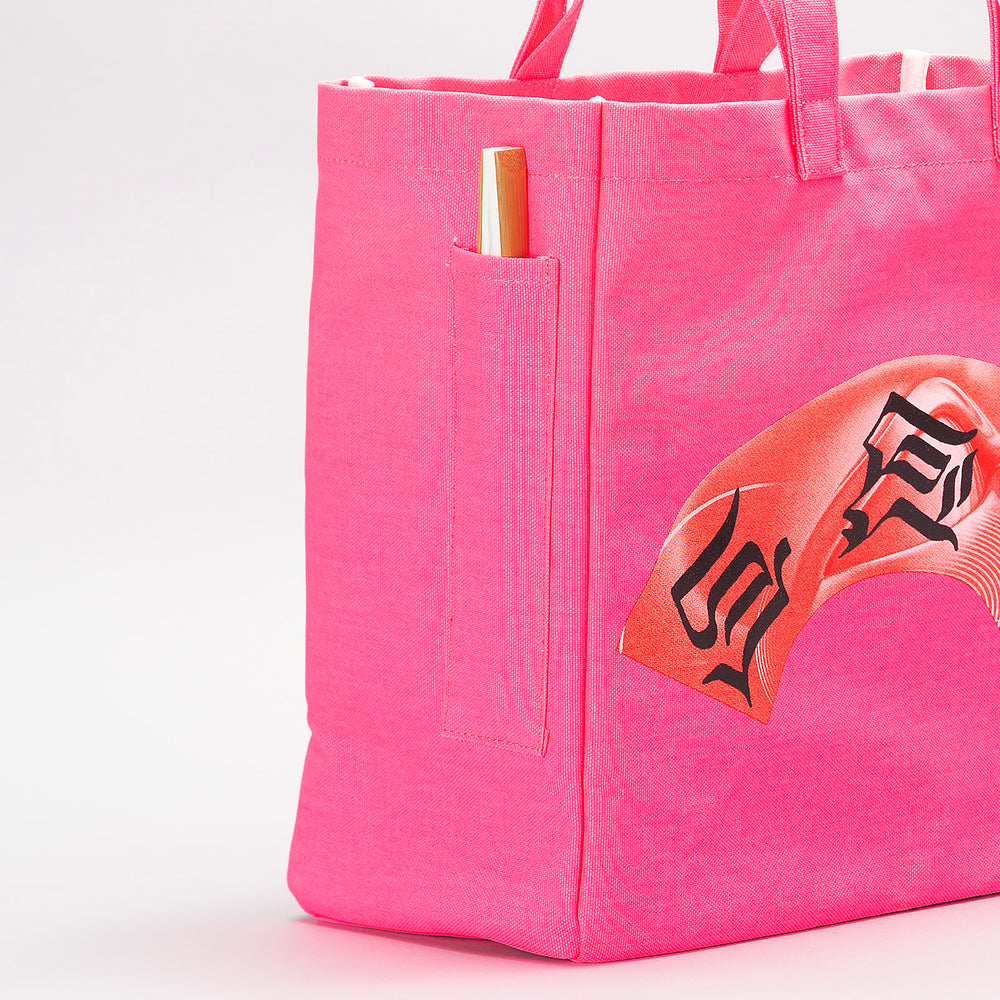 This is a collaboration work with Mahi To The People (GEZAN). The design is based on a bright fluorescent pink background, with a Sensu-shaped graphic of an eye in red, a color that symbolizes GEZAN, and the words "All Senses," which refer to the music festival that GEZAN hosts. With a Sense pocket on the side. This tote bag can be used in two ways: slung over the shoulder or handheld.
