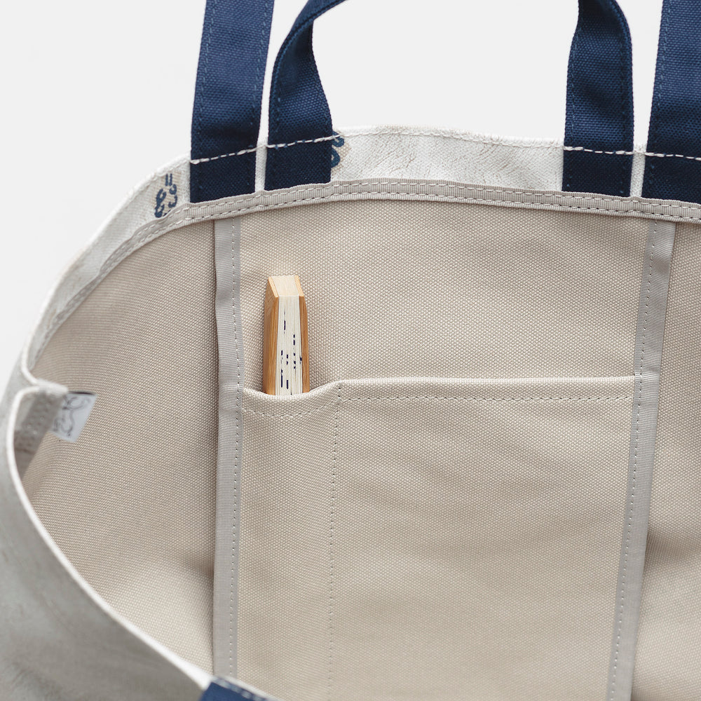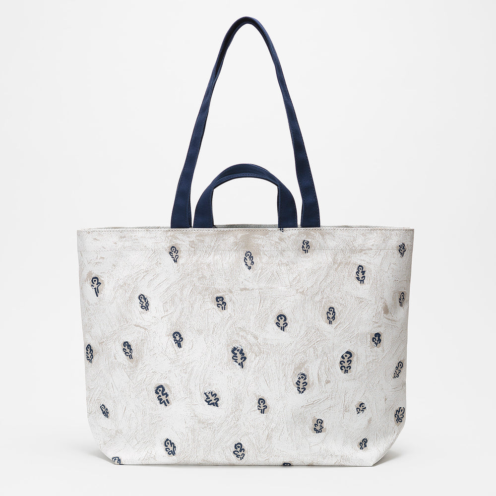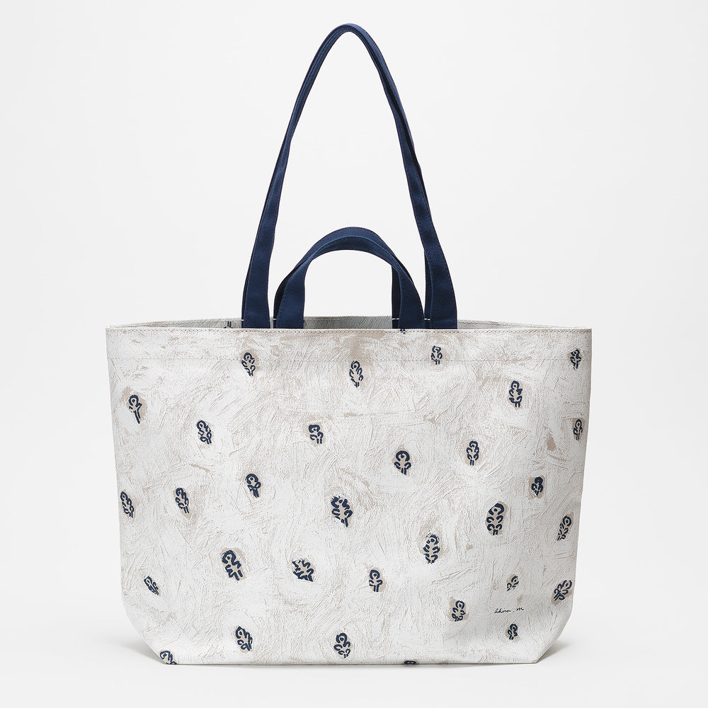 A collaborative work with Akira Minagawa (designer for Mina Perhonen) (original title: "Hana-kiri"). Cute wildflower and white mist motifs are printed on both sides. Comes with an inner pocket for a folding fan. A 2-way tote bag that can be carried on the shoulder or by hand.
