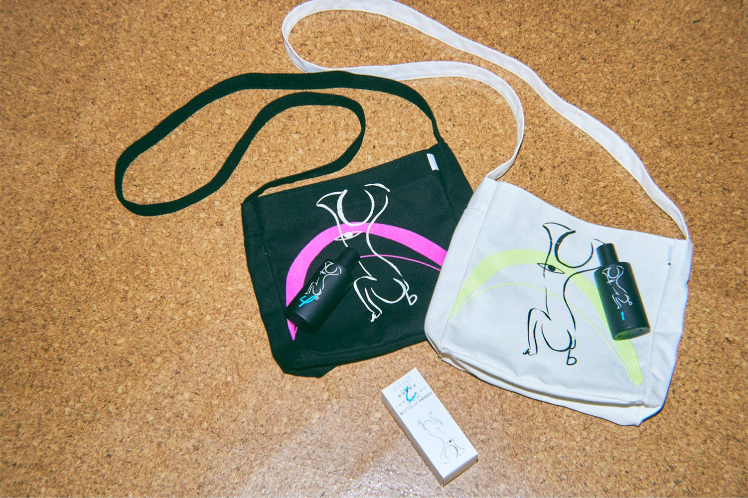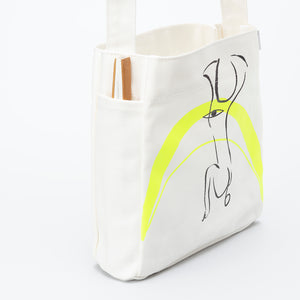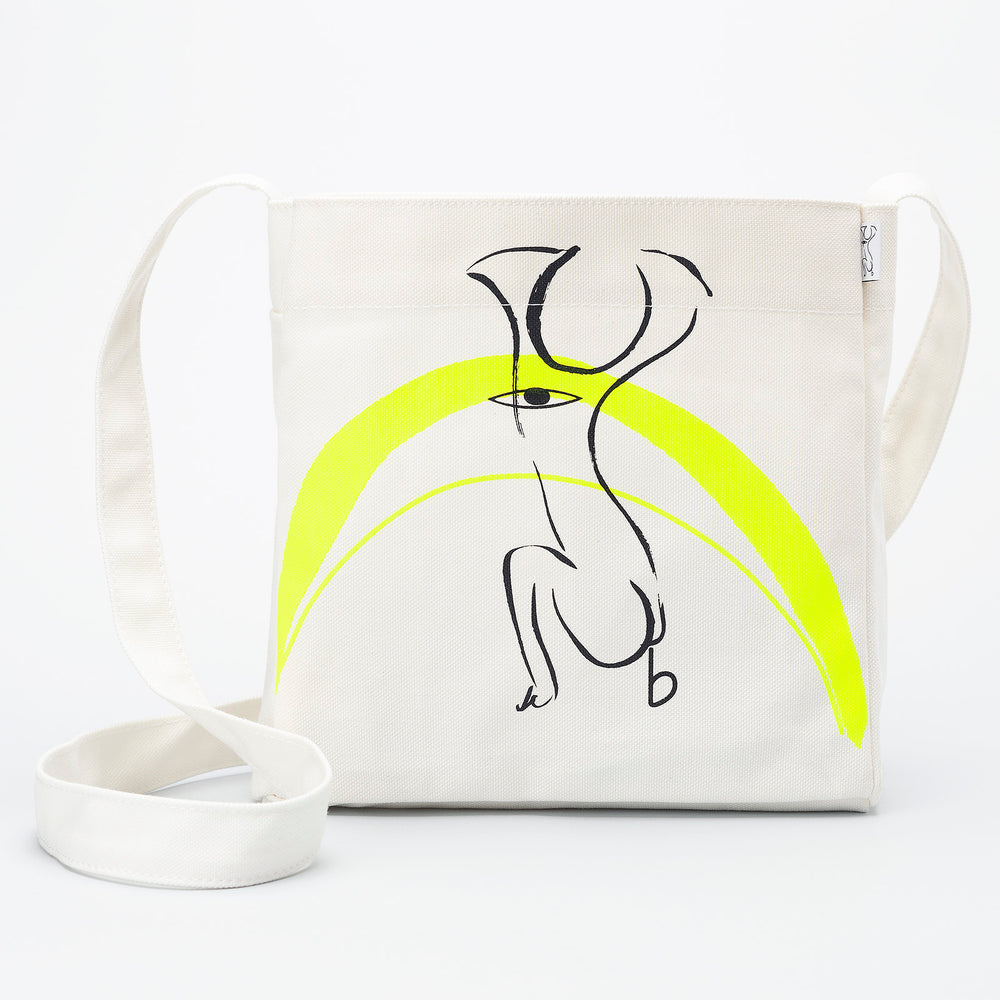 Compact size shoulder bag with brand symbol on white canvas. With a Sensu pocket on the side.