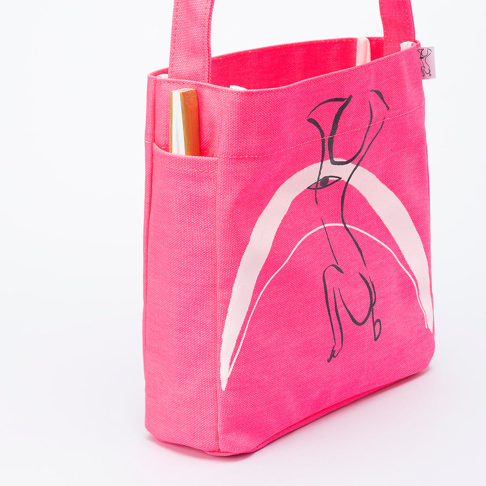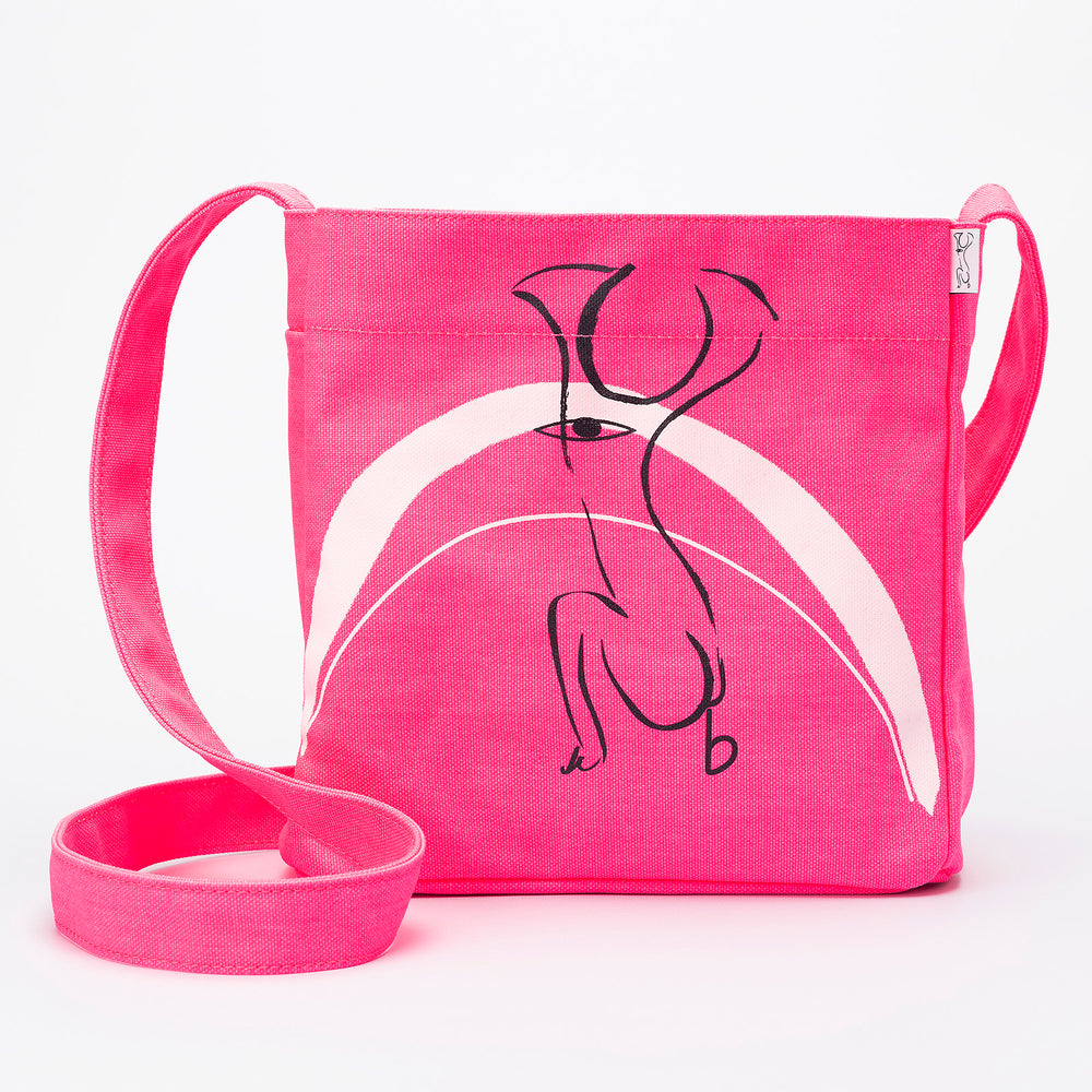 A compact shoulder bag in fluorescent pink canvas with the brand's symbol on it. With a Sensu pocket on the side.