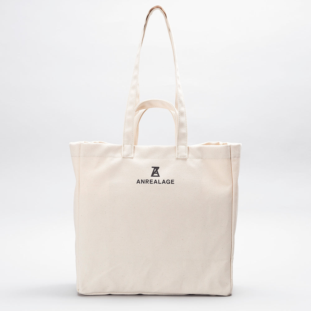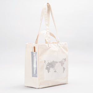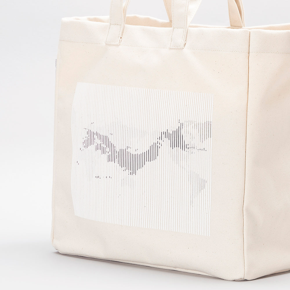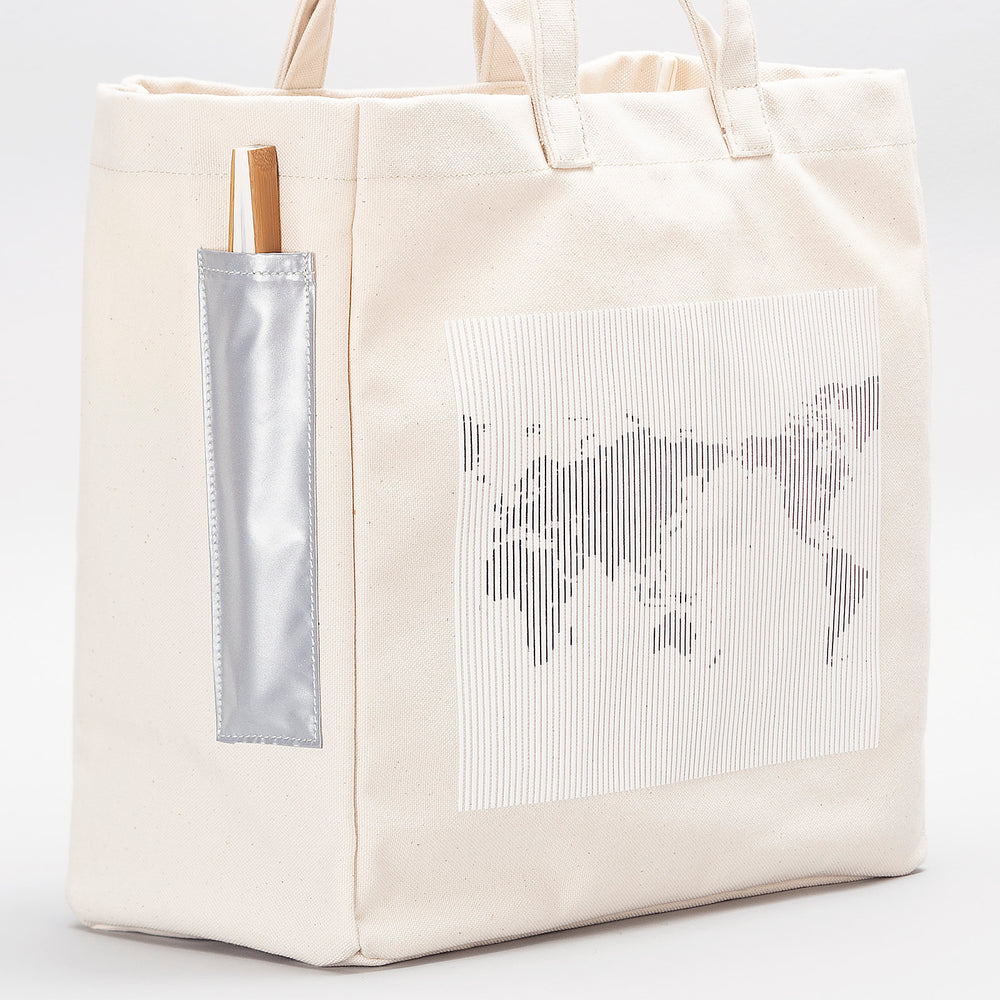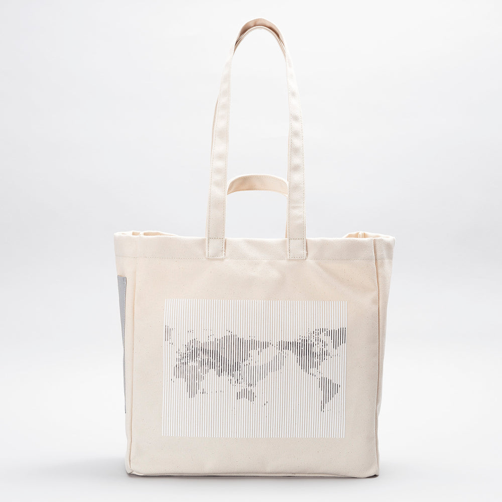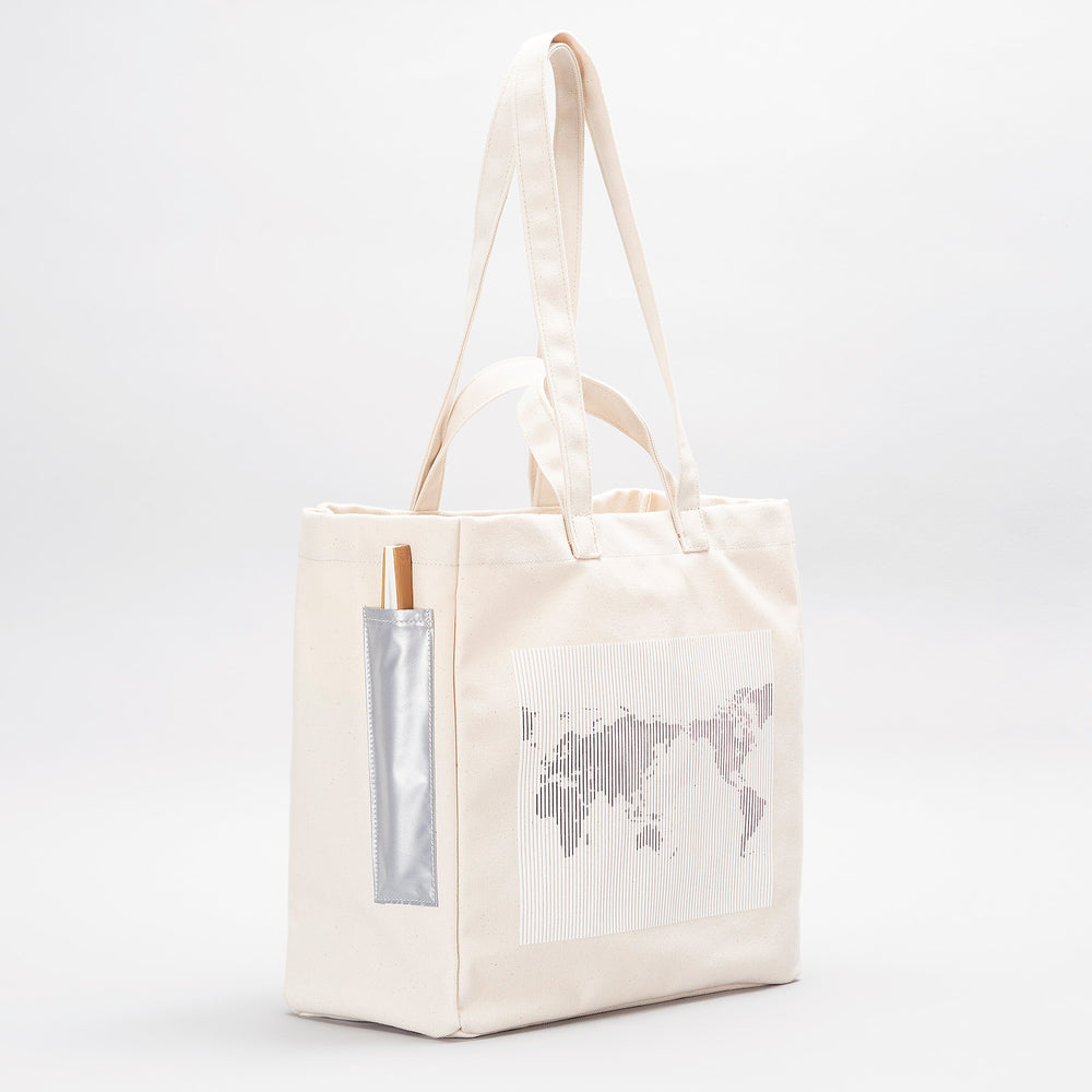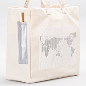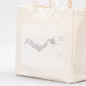 ANREALAGEとのコラボレーション作品(原題「A WORLD UN WORLD 」)。世界と日本をテーマにデザイン。特殊な印刷技法を採用することで見る角度によって絵柄が変化し、世界地図と日本地図が浮かび上がります。サイドに配した扇子ポケットは、光を反射するリフレクター素材を使用。肩掛け、手持ちの2wayで使えるトートバッグ。